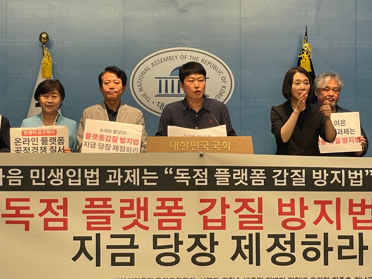 더불어민주당 을지로위원회와 참여연대, 민변 민생경제위원회, 온라인플랫폼제정촉구공동행동 등은 9일 오전 국회 소통관에서 기자회견을 열고 “상법 개정안이 통과됐고, 이제 남은 다음 민생개혁 입법은 온라인 플랫폼법”이라며 “7월 임시국회에서 여야 합의를 통해 온라인 플랫폼법을 처리해야 하고, 만일 국민의힘이 끝까지 반대해 여야 합의가 이뤄지지 않는다면 패스트트랙 안건으로라도 지정해서라도 빠르게 제정해야 한다”고 주장했다.