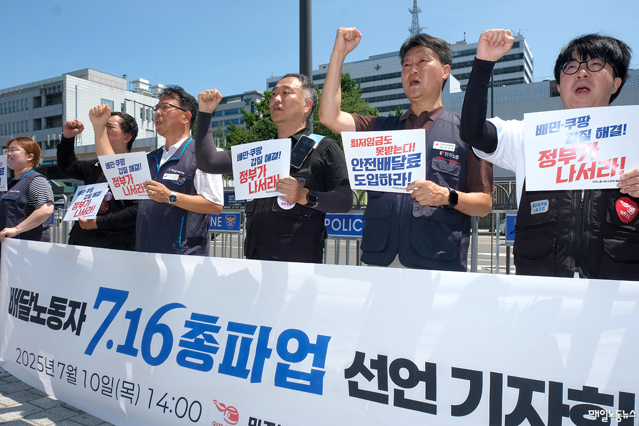 이전 기사보기 다음 기사보기 2025-11-26 “배민·쿠팡 갑질 멈춰라” 바로가기 복사하기 본문 글씨 줄이기 본문 글씨 키우기 스크롤 이동 상태바 노동조합 “배민·쿠팡 갑질 멈춰라” 기자명 정기훈 기자 입력 2025.07.10 19:02 댓글 0 다른 공유 찾기 바로가기 본문 글씨 키우기 본문 글씨 줄이기 이 기사를 공유합니다 페이스북(으)로 기사보내기 트위터(으)로 기사보내기 카카오스토리(으)로 기사보내기 URL복사(으)로 기사보내기 닫기 ▲ 정기훈 기자 배달플랫폼노조가 10일 오전 용산 대통령실 인근에서 안전배달료 도입과 배민·쿠팡 갑질 해결을 요구하는 7·16 총파업 선언 기자회견을 하고 있다. 정기훈 기자 photo@labortoday.co.kr 겨울, 농성 저작권자 © 매일노동뉴스 무단전재 및 재배포 금지 SNS 기사보내기 공유 이메일 기사저장 관련기사 노동·시민·사회단체, ‘노동자 안전 보장’ 쿠팡 주주제안서 작성 나선다 댓글삭제 삭제한 댓글은 다시 복구할 수 없습니다. 그래도 삭제하시겠습니까? 비밀번호 닫기 기사 댓글 0 댓글 접기 댓글입력 권한이 없습니다. 댓글 내용입력 비회원 로그인 이름 비밀번호 댓글 내용입력 댓글쓰기 계정을 선택하시면 로그인·계정인증을 통해 댓글을 남기실 수 있습니다. 회원 로그인 이름 비밀번호 자동등록방지 로그인 옵션 창닫기