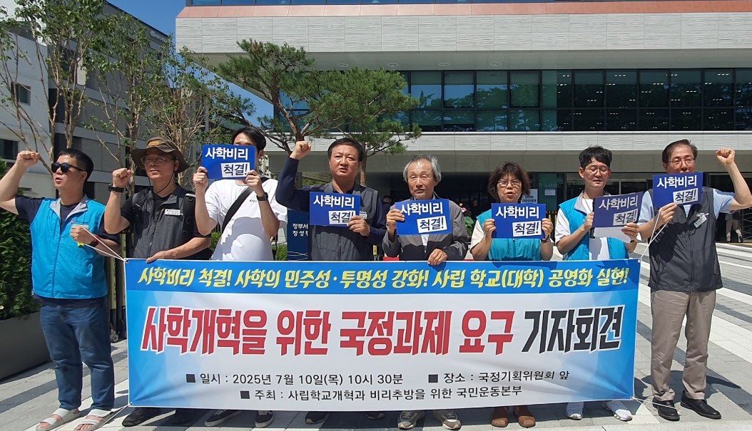 사립학교개혁과 비리추방을 위한 국민운동본부는 10일 오전 서울 종로구 국정기획위원회 앞에서 기자회견을 열고 “국민 세금과 등록금이 투입되는 교육기관이 사유재산처럼 운영되고, 심지어 비리에 연루된 경영진이 징계 없이 복귀하거나 타 학교로 이동하는 현실은 반드시 개선돼야 한다”며 “이재명 정부는 사립학교 개혁을 국정과제로 명확히 채택하라”고 촉구했다. 운동본부에는 교수노조·전교조·대학노조·비정규교수노조 같은 교육 분야 노조를 포함해 교육·노동·사회단체들이 참여한다.