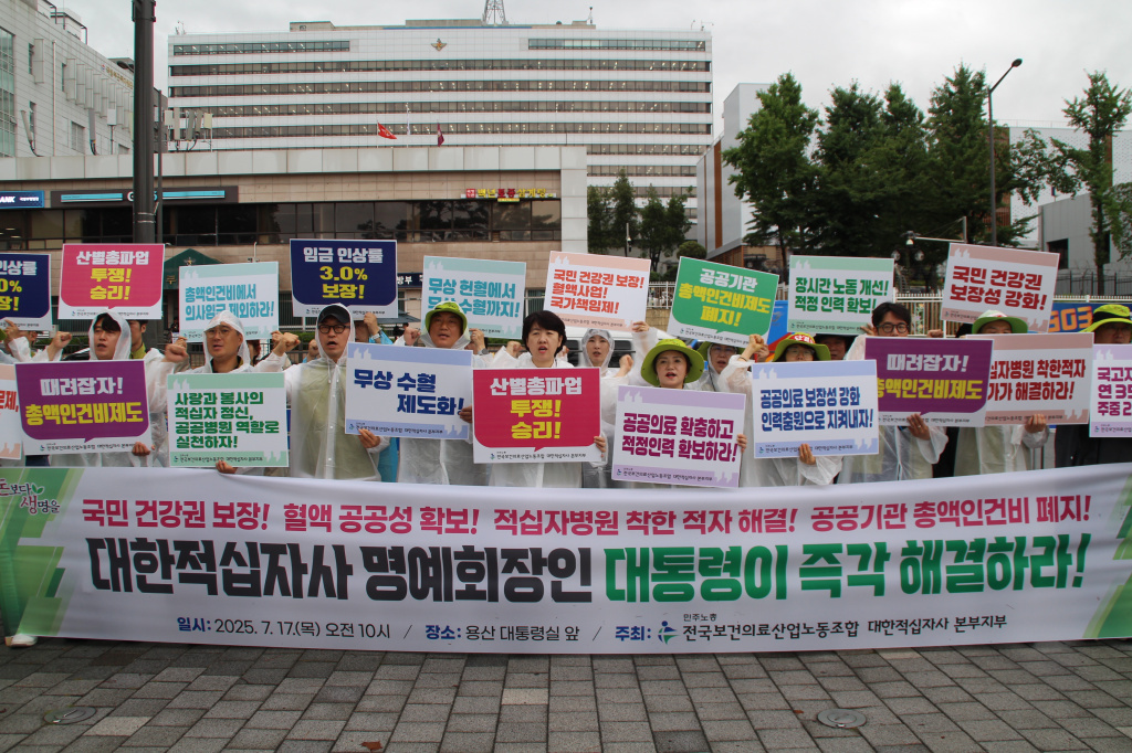 보건의료노조는 17일 오전 용산 대통령실 앞에서 노조 대한적십자사본부지부(지부장 정연숙) 파업 선포 기자회견을 열었다. 지부는 지난 5월13일부터 사쪽과 2025년 임금·단체교섭을 8차례 진행한 데 이어 이달 8일 쟁의조정에 나섰다. 조합원은 2천700여명으로, 쟁의행위 찬반투표는 투표율 98%·찬성률 85%로 가결됐다.