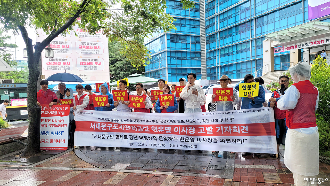 민주일반노조 서대문구도시관리공단지회(지회장 장희정)는 17일 오전 서대문구청 본관 정문 앞에서 기자회견을 열고 한운영 공단 이사장을 경찰에 고발했다고 밝혔다. 고발 내용은 △노조탄압, 직장내 갑질, 부당해고 △지인을 통한 수의계약, 강사료 지급 등 업무상 배임 △구의회 행정사무감사 위증 △공공기록물 훼손 등이다.