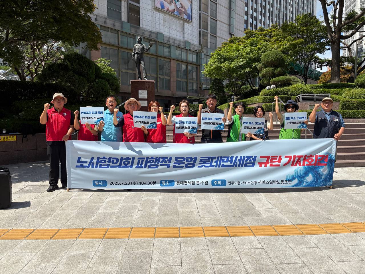 서비스일반노조 롯데면세점지회(지회장 김금주)는 23일 오전 서울 중구 롯데면세점 본사 앞에서 기자회견을 열고 노사협의회가 선거규정을 위법하게 개정했다며, 지난 18일 이와 관련해 서울지방고용노동청에 진정을 냈다고 밝혔다.