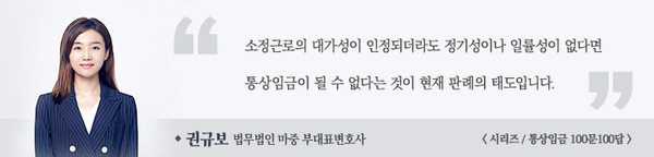 즉, 소정근로의 대가성이 인정되더라도 정기성이나 일률성이 없다면 통상임금이 될 수 없다는 것이 현재 판례의 태도입니다.