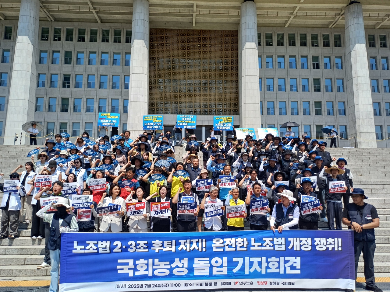 민주노총은 25일 진보당과 함께 서울 영등포구 국회 본청 계단 앞에 농성장을 설치하고 정부안 저지와 특수고용·플랫폼 노동자 적용 확대를 포함한 온전한 노조법 개정을 위한 농성을 시작한다고 밝혔다.