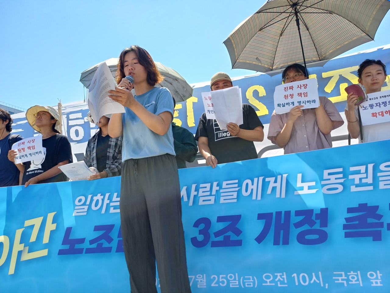 이날 참가자들은 최근 고용노동부가 더불어민주당 국회 환경노동위원들을 만나 설명한 노조법 수정안에 대한 비판에도 목소리를 높였다.
