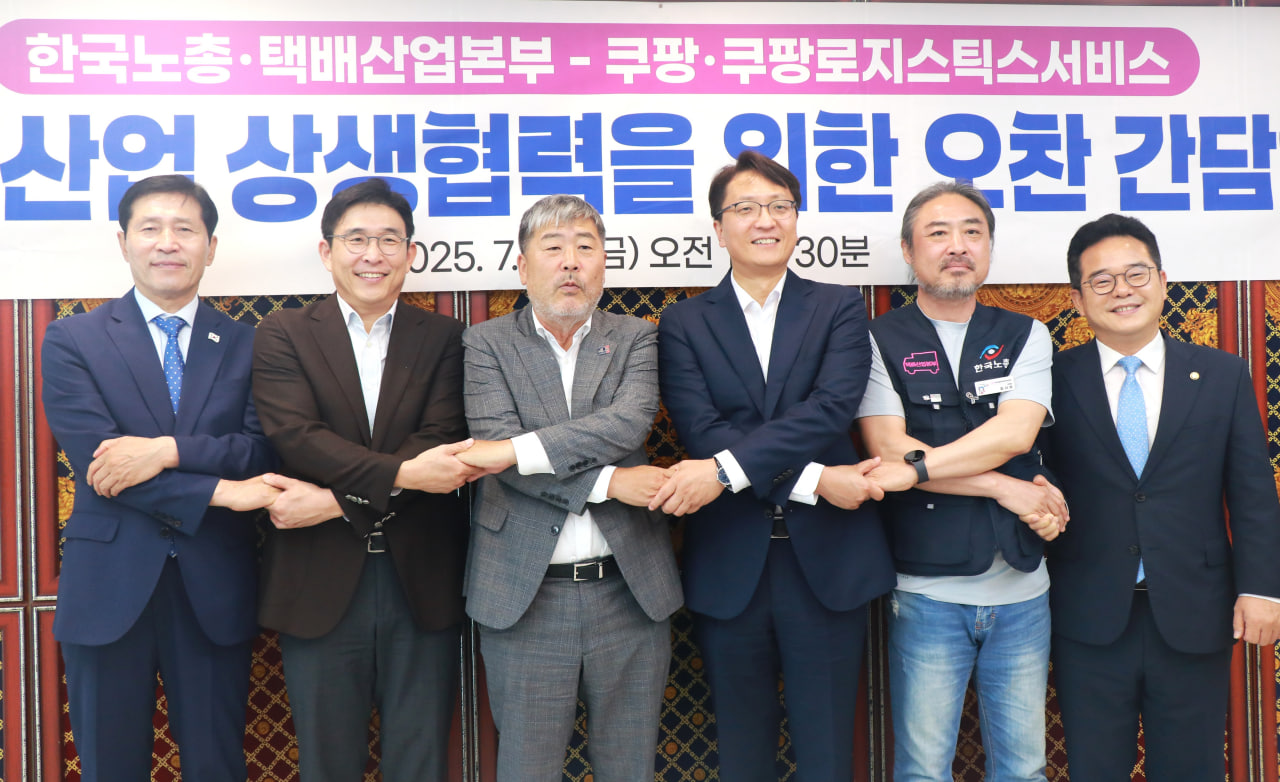 한국노총과 전국연대노조 택배산업본부·쿠팡·쿠팡로지스틱스서비스(CLS)는 25일 오전 서울 여의도 한 식당에서 오찬 간담회를 갖고 협의체 구성에 합의했다고 밝혔다. 간담회에는 김동명 한국노총 위원장, 김사성 전국연대노조 택배산업본부 위원장, 박대준 쿠팡 대표, 홍용준 쿠팡CLS 대표, 이학영 국회부의장, 민병덕 더불어민주당 을지로위원회 위원장이 참석했다.