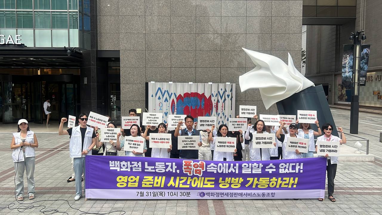 기록적 폭염 속 백화점 노동자들이 매장 오픈 전 냉방이 꺼진 고온의 실내에서 노동을 이어 가고 있다. 노조는 백화점업계에 영업 전 냉방 가동을 촉구했다.