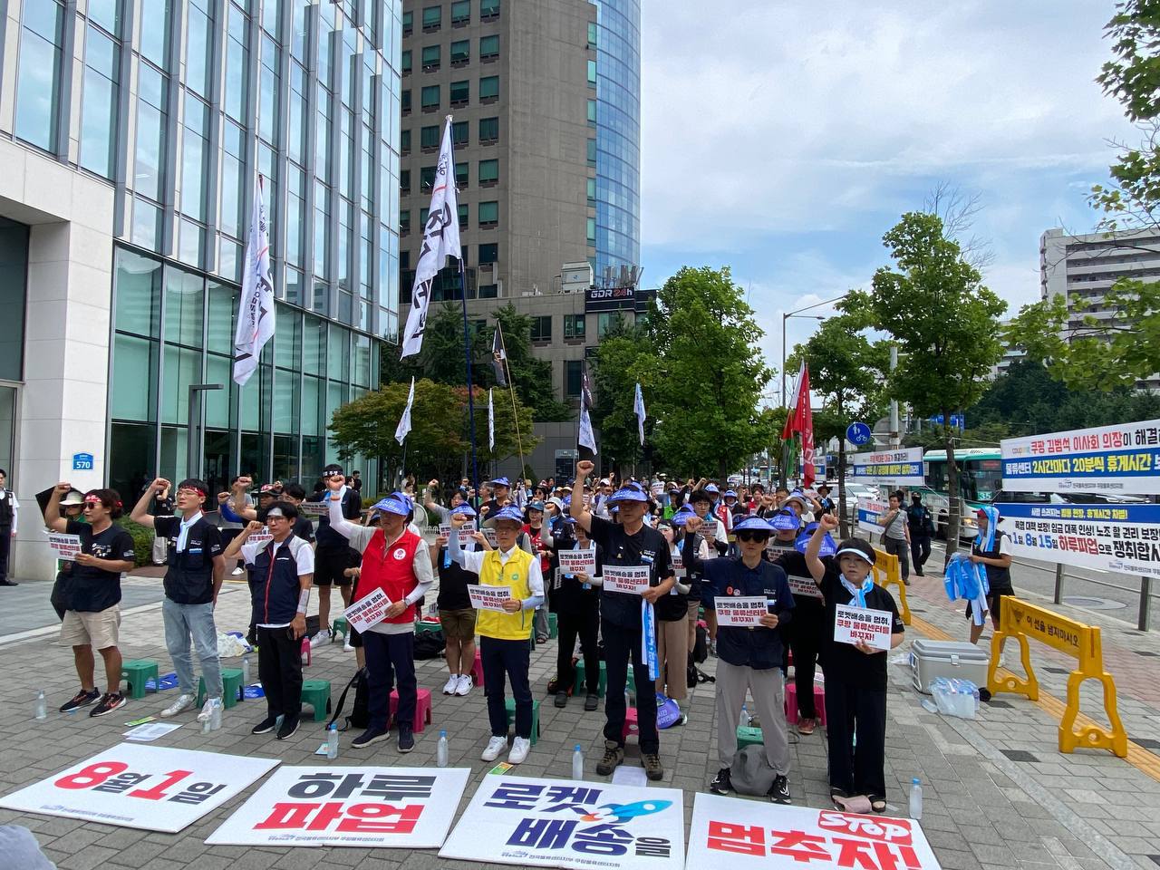 쿠팡 물류센터 노동자들이 단체협약 체결과 냉방대책을 촉구하며 1일 파업했다.