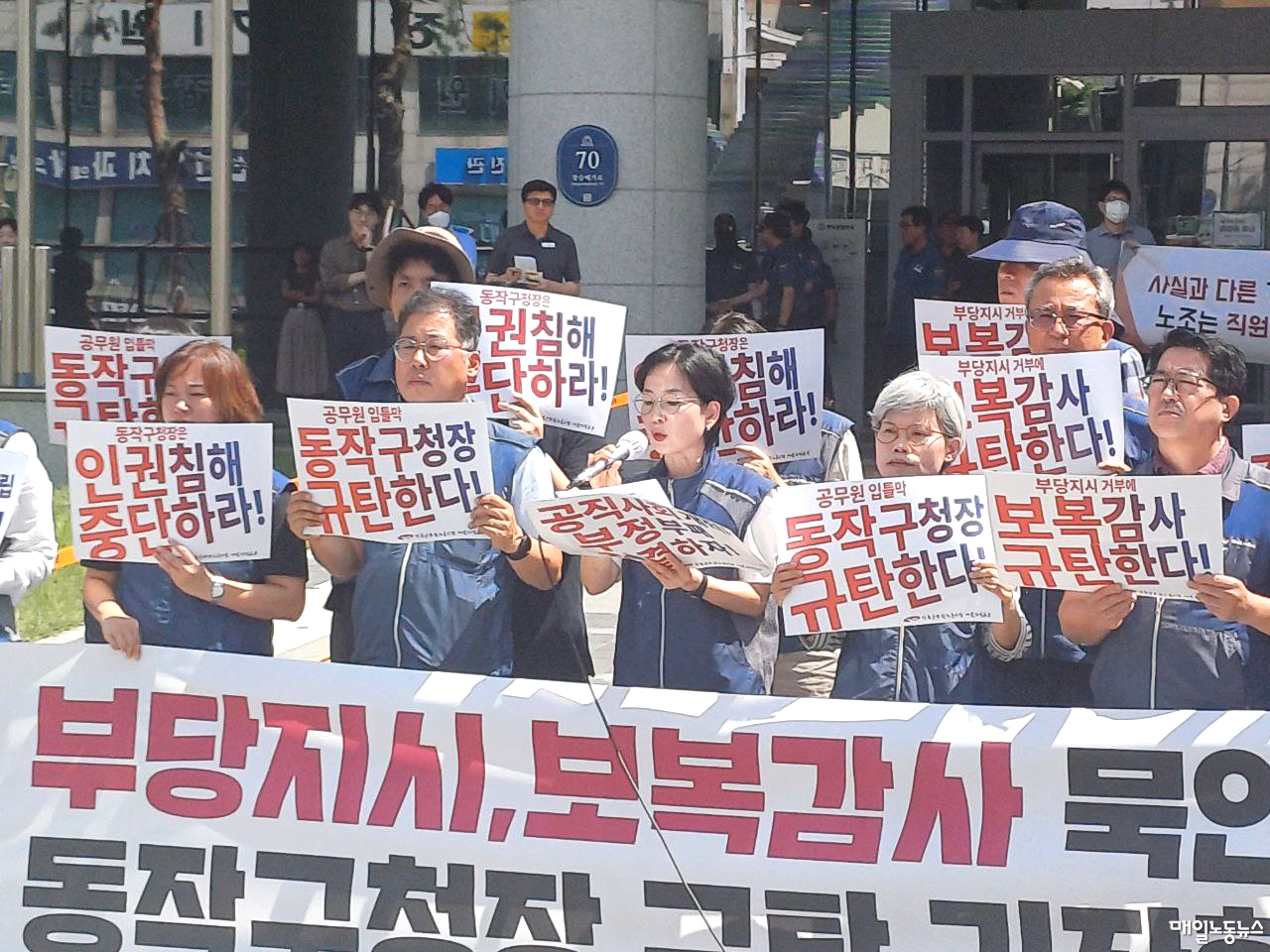 공무원노조 서울지역본부 동작구지부는 5일 오전 서울 동작구청 앞에서 기자회견을 열고 구청의 부당지시와 보복감사를 규탄했다.