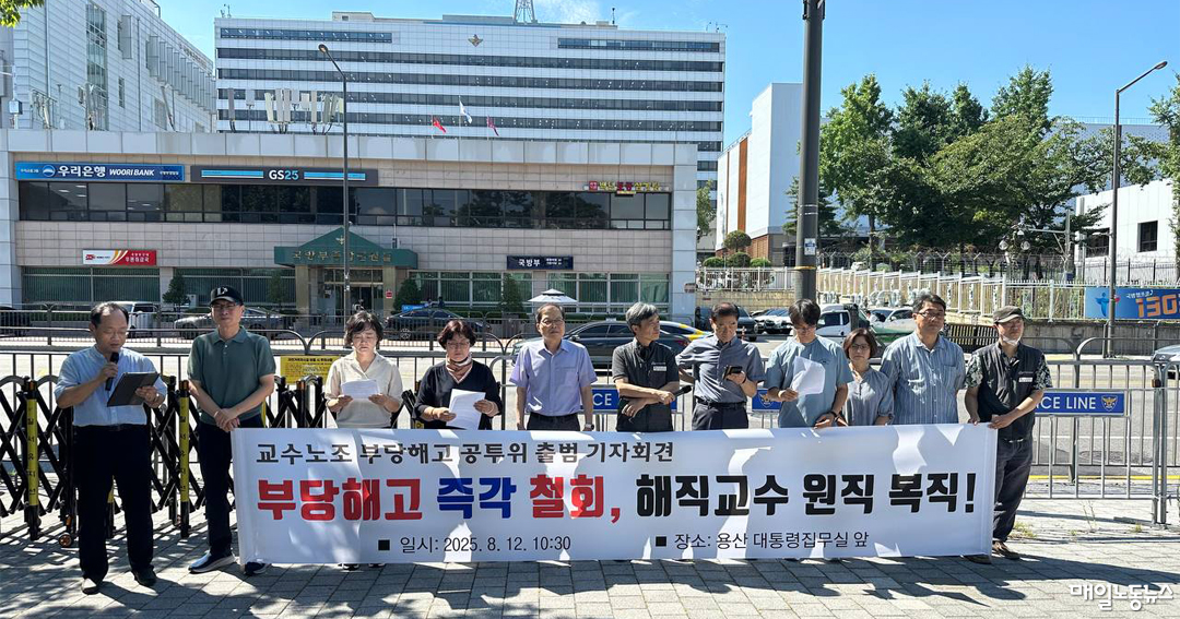 노조는 12일 오전 용산 대통령실 앞에서 열린 기자회견에서 ‘교수노조 부당해고 철회와 재발방지를 위한 공동투쟁위원회’(위원장 김형진) 출범을 알리며 “정부는 기본적인 노동권이 지켜지지 않는 대학에 대해 즉각적인 특별감사를 실시하라”고 촉구했다.