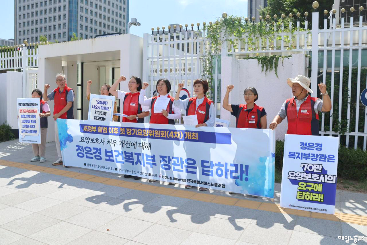 한편 이번 기자회견은 이날 오후 이스란 보건복지부 1차관 주재로 열린 복지부 4차 장기요양위원회 회의를 겨냥해 열었다. 노조는 이날 4차 회의에서 장기근속장려금 제도 개편을 비롯한 요양보호사 처우개선 논의가 있었던 것으로 파악하고 있다. 노조는 “장기요양위는 제대로된 장기근속장려금 제도 개선와 구체적인 개선 계획을 내야 할 것”이라며 “또한 정 장관이 직접서비스 주체인 요양보호사를 직접 만나 이야기를 듣길 바란다”고 강조했다.