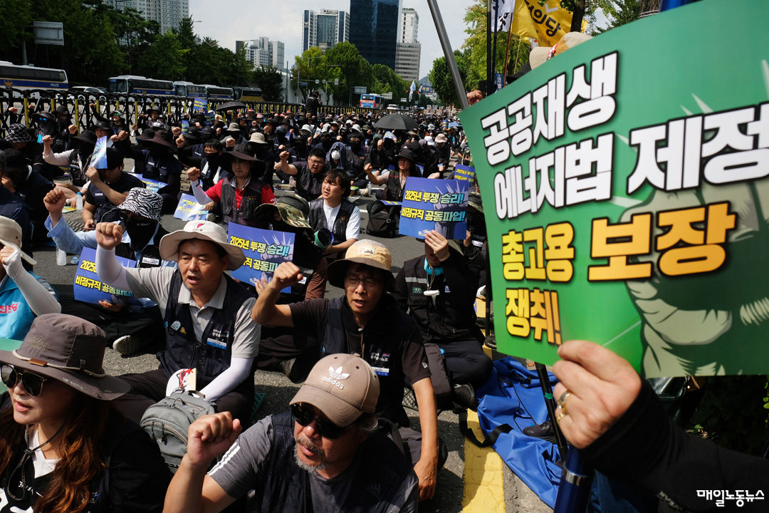 공공운수노조(위원장 엄길용)는 이날 오후 서울 용산 대통령실 인근에서 발전 비정규 노동자 총파업 대회를 열고 “공공재생에너지법을 제정해 발전노동자 총고용을 보장하라”고 촉구했다.