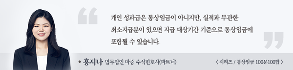 정리하자면, 개인 실적과 관계없이 최소한의 금액을 지급하기로 한 경우, 그 최소지급분은 근로 대가성·정기성·일률성을 모두 충족하므로 통상임금에 해당합니다. 또한 판단 기준과 통상임금 귀속 시점은 ‘실제 지급한 해’가 아니라 ‘근무실적이 있었던 해’로 보아야 합니다.