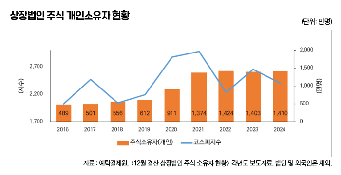 2019년 12월 612만명 규모이던 우리나라 상장법인의 개인투자자는 2020년 911만명으로 늘어났고, 2021년에는 1천374만명으로 늘어나 불과 2년 만에 두 배 이상 규모로 증가했다. 2024년말에는 1천410만명으로 15세이상 인구(4천684만명) 3명 중 1명(30.1%)이 주식계좌를 갖고있는 나라가 됐다.