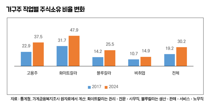 2017년에 22.9% 수준이던 고용주의 주식보유 비율은 2024년에 37.5%로 증가했고, 화이트칼라의 같은 기간 비율은 31.7%에서 47.9%로 상승해 절반에 가까운 가구가 주식을 보유하게 됐다. 그런데 블루칼라 노동자 가구의 주식 보유 비율도 14.2%에서 25.5%로 크게 증가해 자영업(28.2%)과 거의 비슷한 수준을 이루게 됐다.