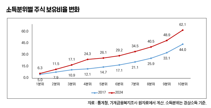 하지만 소득분위별로 구분해서 보면 고소득층일수록 주식보유 비율이 더 큰 폭으로 상승했고, 소득이 낮아질수록 상승폭도 적었던 것으로 나타난다. 최하위 저소득층에서는 거의 변화가 없거나 한자리 수 정도의 낮은 증가율을 보였다.
