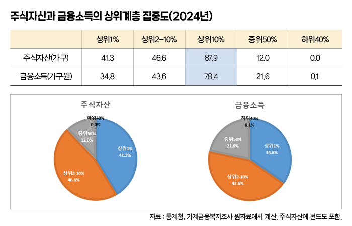 다음으로 주식투자의 저변이 크게 확대됐지만 소유집중이 심한 자산시장의 본질과 특성은 거의 변하지 않았다. 주식자산의 집중도가 그 중에서도 특히 심하고 주식에서 파생되는 금융소득의 집중도도 가장 심한 편이다. 경상소득 기준으로 2023년 상위 10%의 소득점유 비중이 29.3%인데, 총자산의 상위 10% 점유 비중은 43.0%에 달한다. 주식자산의 경우 이보다 훨씬 더 심해서 상위 1%의 자산비중이 41.3%에 달하고 상위 10%까지 합치면 전체 주식자산의 87.9%를 가진 것으로 나타난다. 그리고 자산에서 발생하는 이자와 배당 등 금융소득도 상위 1%의 점유비중이 34.8%에 이르고 상위 10%의 비중은 78.4%에 달한다.