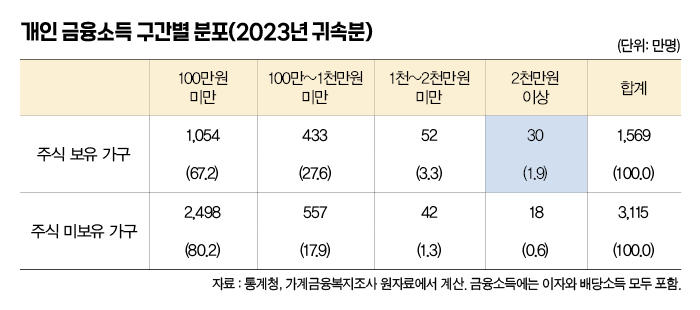 한편 금융소득이 2천만원을 초과하는 경우 종합과세 대상이 되는데, 가계금융복지조사 분석 결과 여기에 해당하는 가구원은 2023년 귀속분을 기준으로 30만명으로 1.9%만이 해당되고, 앞으로 배당소득 증가로 종합과세 대상에 포함될 가능성이 있는 1천만원 이상 소득자도 52만명 3.3% 수준에 그치고 있다. 주식을 가진 1천569만명 가구원 가운데 94.8%가 기존 제도 하에서의 배당소득 과세로 인한 영향은 거의 받지 않는 상태인 것이다.