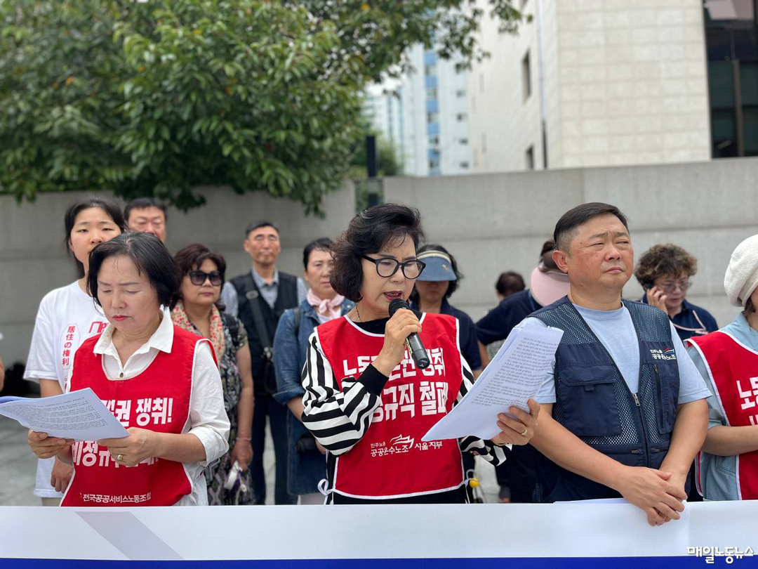 공공운수노조 서경지부는 16일 오전 서울 서대문구 이화여대 앞에서 기자회견을 열고 “이재명 정부 노동정책을 설계하고 추진할 전문가그룹에서 집단적 노사관계를 다루는 분과장인 이승욱 이화여대 법학전문대학원 교수가 한 강연에서 원청 사업 수행에 필수적이지 않아 청소·경비노동자는 원청과 교섭이 어려울 것이라는 믿기 어려울 망언을 했다”고 비판했다.