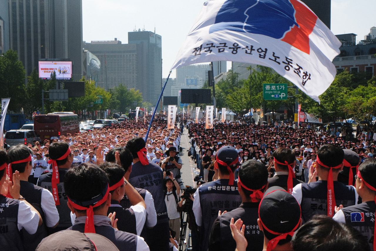 김형선 위원장은 “오늘 우리를 5년, 10년 후 대한민국 국민과 언론은 그날 금융노동자 선택이 옳았다고 기억할 것”이라며 “노조가 2002년 주 5일제를 도입하고 나서 2011년 대한민국에 주 5일제 시대가 열렸는데 우리는 다시 그 역사를 만들어내겠다”고 말했다.