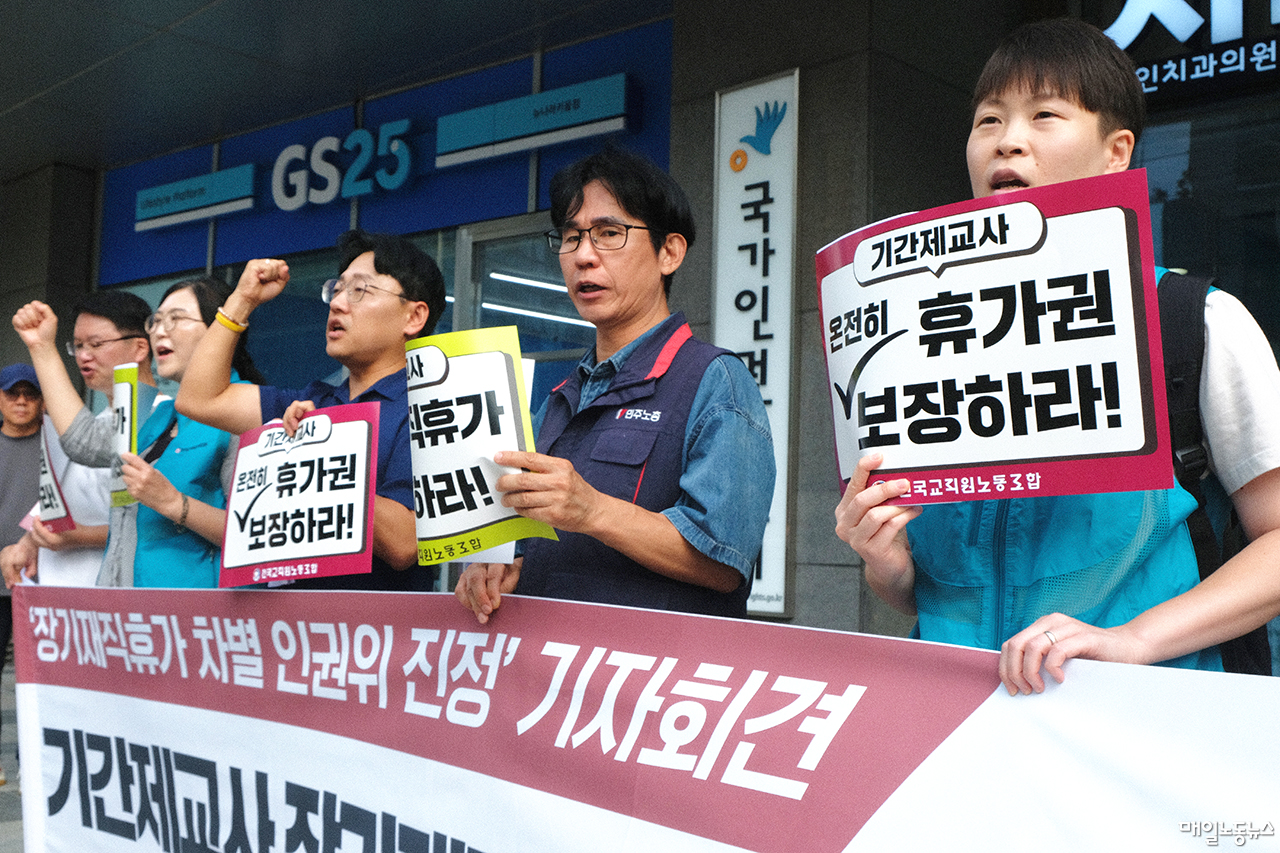 전교조는 29일 오후 서울 중구 인권위 앞에서 기자회견을 열고 “인권위는 기간제교사의 장기재직휴가권 차별 시정을 권고하라”고 요구했다.