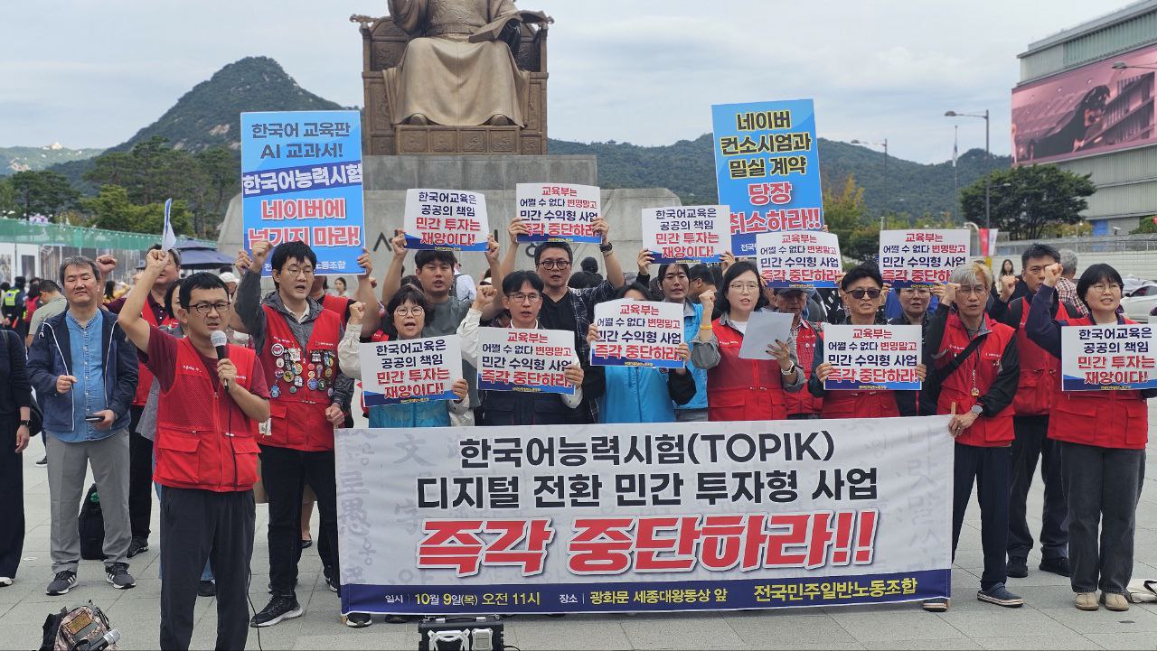 민주일반노조 한국어강사분과는 9일 서울 종로구 광화문광장 세종대왕동상 앞에서 기자회견을 열고 교육부가 추진 중인 ‘TOPIK 디지털 전환 민간투자형 사업’ 중단을 촉구했다. TOPIK은 교육부 직속 책임운영기관인 국립국제교육원이 주관하는 시험으로 외국인들의 비자 취득, 취업, 대학입학 등에 필요하다.