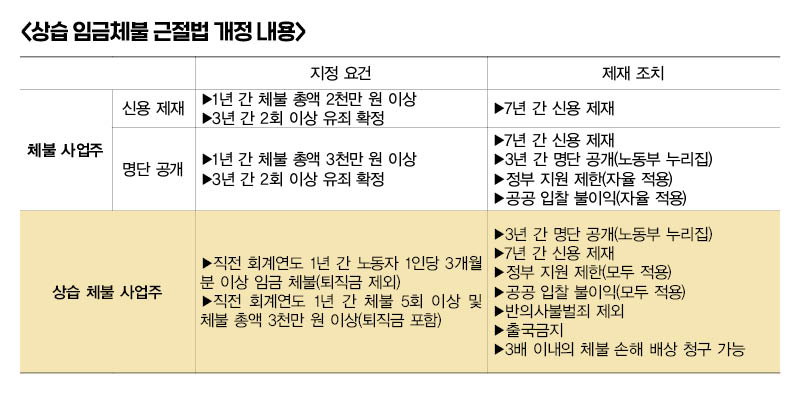 노동부는 2013년 제도 도입 이후 지금까지 3천448명의 체불 사업주 명단을 공개하고, 5천854명에 대해 신용 제재를 취했다. 이번 법 시행으로 상습 체불 사업주 명단이 별도로 추가된다. 이에 따라 대표이사와 사업장 위치, 사진 등 공개 범위를 확대해 실효성을 높일 필요가 있다.