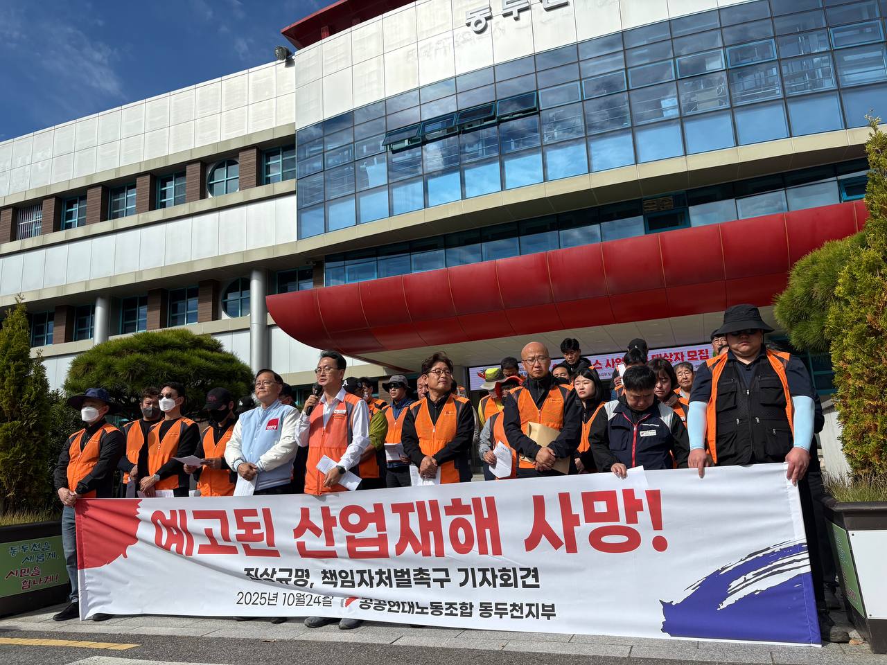 공공연대노조 경기본부 동두천지부는 24일 오후 동두천시청 앞에서 기자회견을 열고 환경미화 노동자 사망 사고와 관련한 대책 마련과 책임을 촉구했다.
