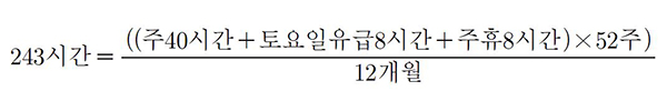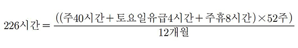 토요일 유급 근로시간을 4시간으로 보면 ‘월 통상임금 산정 기준시간수’는 226시간이고 8시간으로 보면 243시간이 된다.