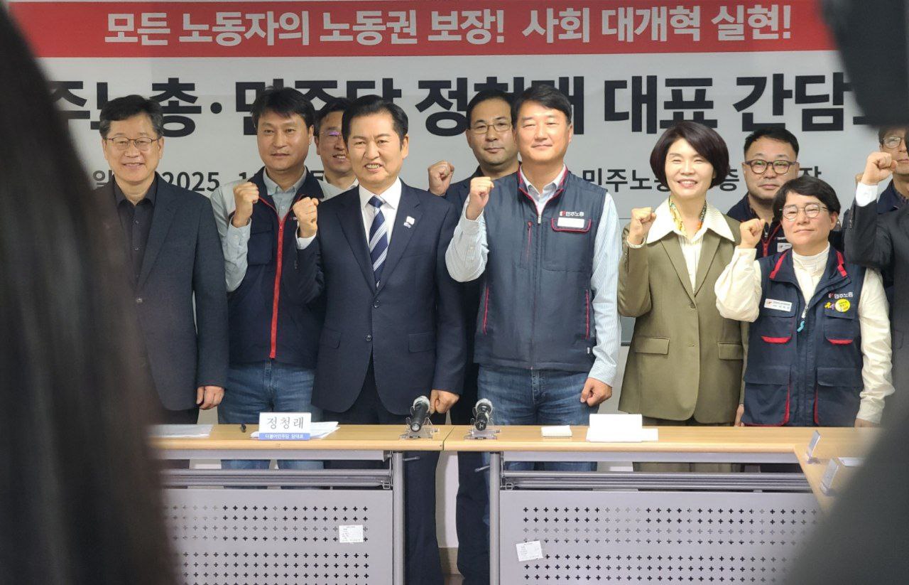 정청래 더불어민주당 대표가 민주노총을 방문해 노동자 작업중지권 확대 입법에 속도를 내겠다고 밝혔다.