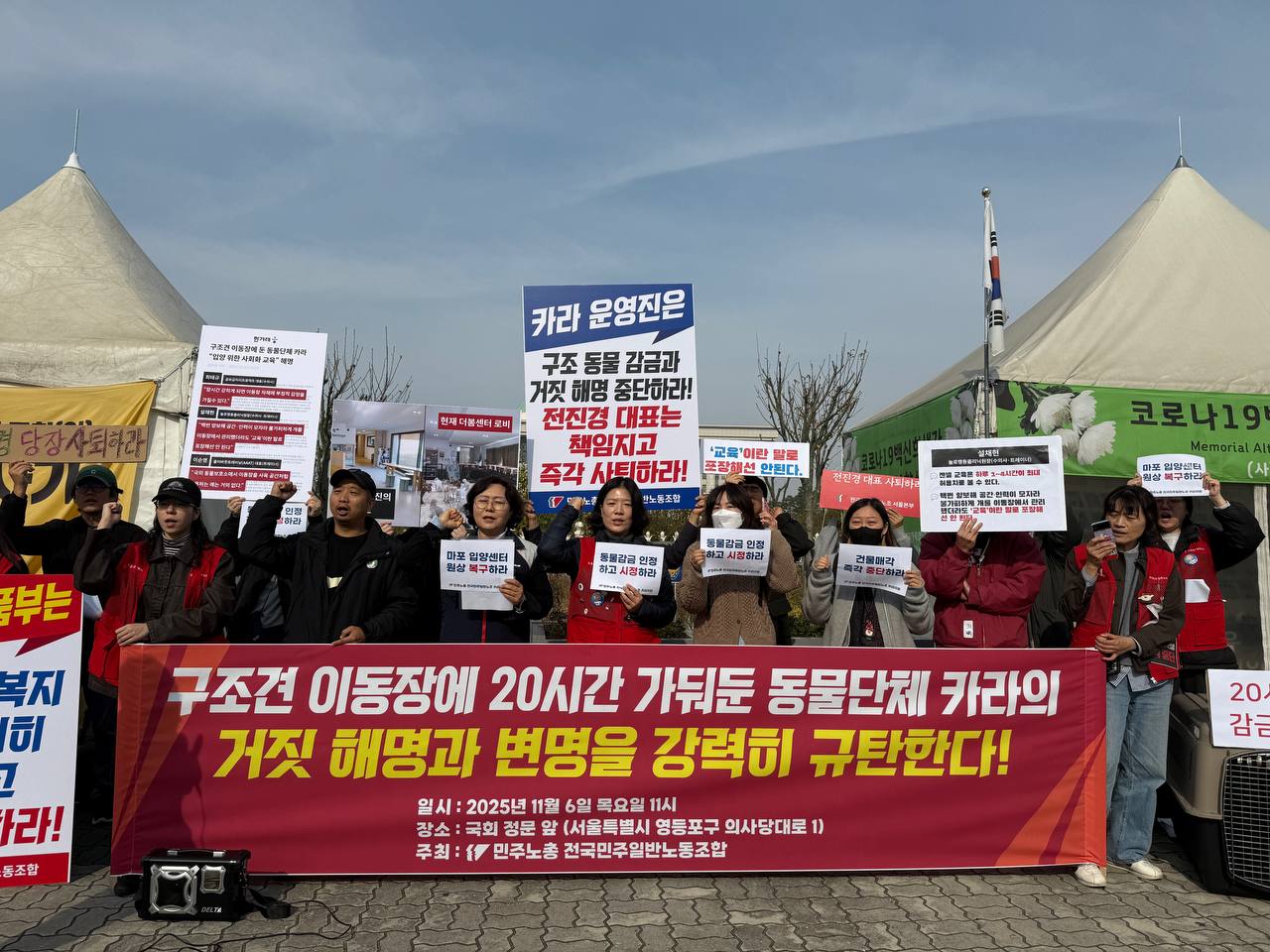 지회는 △농림축산식품부의 실태조사 △구조동물 스트레스 최소화를 위한 공간·인력·교육 시스템 개선 △카라 운영진 책임 및 사퇴 등을 요구했다.