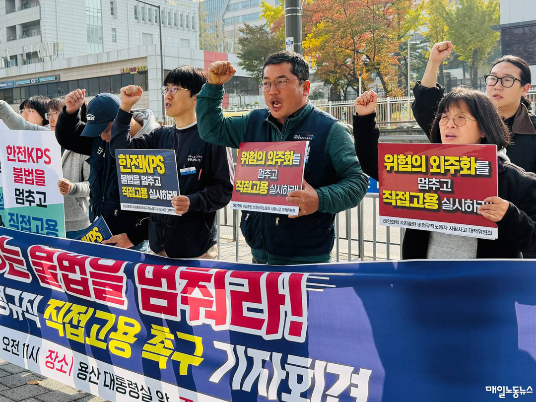 태안화력 고 김충현 비정규직 노동자 사망사고 대책위원회는 6일 오전 용산 대통령실 앞에서 기자회견을 열고 “정부는 한전KPS 불법파견을 바로잡고 직접고용을 이행하라”고 밝혔다.
