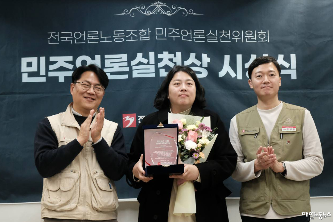 언론노조 민실위는 11일 오후 서울 중구 언론노조 회의실에서 올해 10월 민주언론실천상 시상식을 열고 정 기자에게 상패를 수여했다.