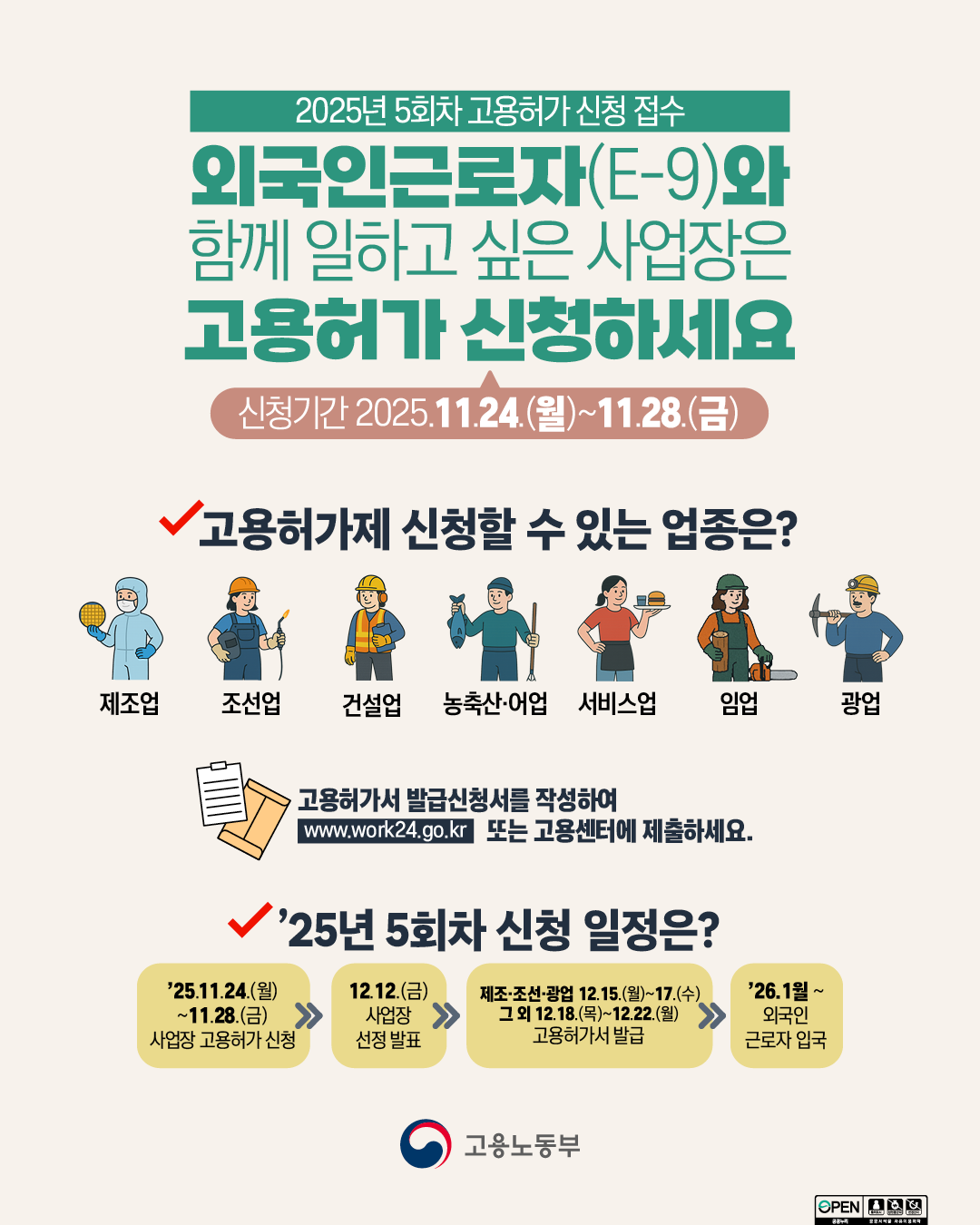 이주노동자 고용을 희망하는 사업주는 일주일간 내국인 구인노력을 거친 뒤 관할 지방고용노동관서를 방문하거나 홈페이지(work24.go.kr)에서 고용허가를 신청하면 된다. 결과는 다음달 12일에 발표한다. 고용허가서 발급은 제조업·조선업·광업의 경우 다음달 15~17일, 농축산업·어업·임업·건설업·서비스업은 같은달 18~22일에 진행된다.