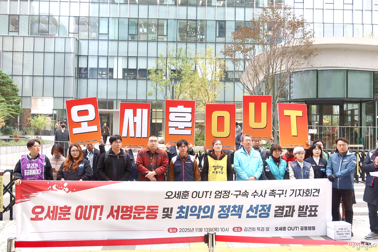 이날 공동행동은 서울 시민 1만명이 참여한 ‘오세훈 OUT! 엄정·구속수사 촉구 서명’을 김건희 특검에 전달하고 수사를 촉구했다. 김진억 민주노총 서울지역본부장은 “일개 정치브로커에게 선거 승리를 의탁하고 특검 수사 칼날 앞에 생명이 달린 오세훈은 더 이상 시장 자격이 없다”고 비판했다.