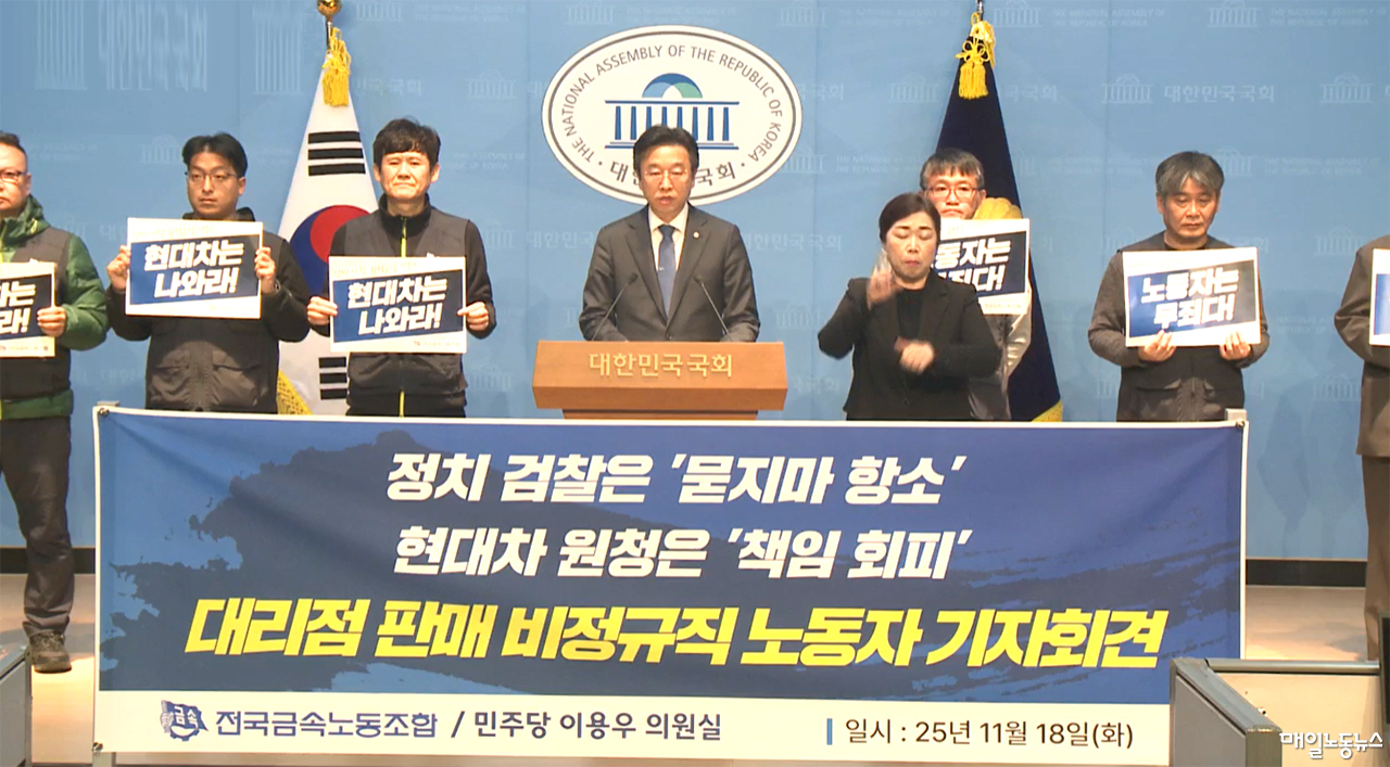 금속노조(위원장 장창열)와 이용우 더불어민주당 의원은 18일 오후 국회에서 기자회견을 열고 “현대차는 대리점 판매노동자의 실질적 사용자로서 교섭에 나오고, 검찰은 ‘묻지마 항소’를 중단하라”고 밝혔다.