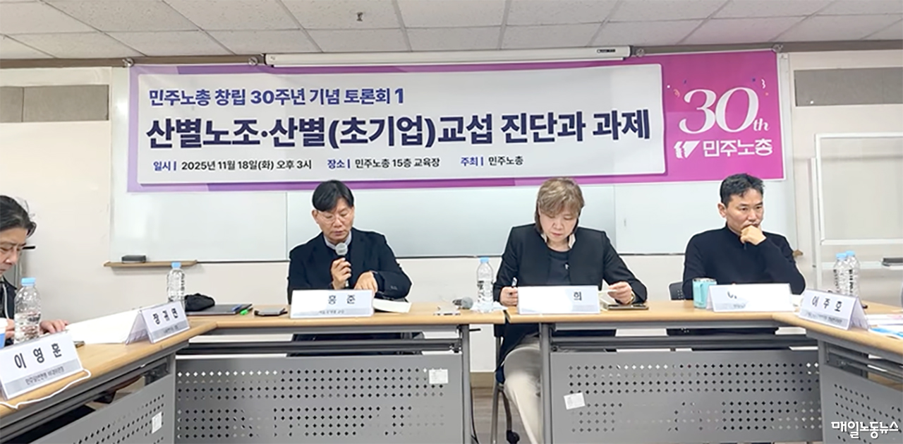 민주노총은 18일 오후 서울 중구 민주노총 교육장에서 창립 30주년 기념 토론회를 열었다. 18일부터 시작된 연속 토론회의 첫 주제는 산별노조·산별교섭의 진단과 과제다. 초기업교섭은 기업별교섭을 넘어 복수의 사용자나 노조가 참여하는 교섭을 의미하며, 동일 산업·업종별로 통일적인 노동조건을 형성할 수 있다는 특징이 있다. 토론회는 28일까지 총 4회 진행한다.
