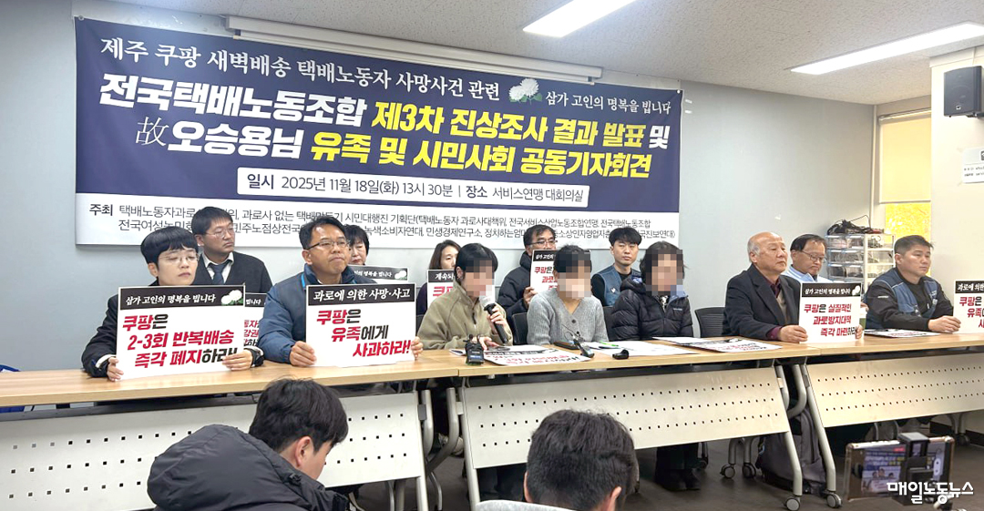 특히 고인은 아버지 장례 중에도 제대로 쉬지 못했다. 장례를 마친 뒤 이달 8일 하루 쉬고 9일 야간 배송에 복귀했으며, 다음날 10일 결국 새벽배송 도중 교통사고로 숨졌다. 고인은 주 6일 고정 철야노동을 하면서도 자유롭게 쉴 수 없는 구조에 놓여 있었다.