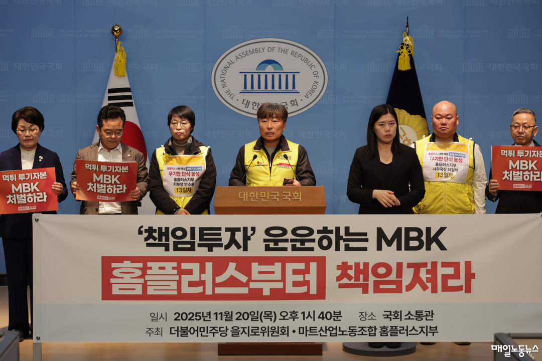 마트노조 홈플러스지부는 20일 오후 국회 소통관에서 기자회견을 열고 MBK 홈플러스의 투자설명 연차총회를 규탄하고 책임 경영을 촉구했다.
