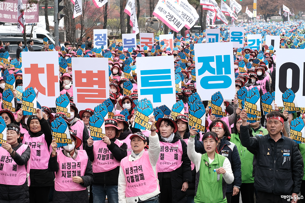 학교비정규 노동자들이 최저임금에 미달하는 기본급 인상을 요구하며 권역별 릴레이 파업에 돌입했다.