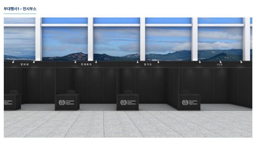 전시부스에는 국제노동기구(ILO) 국제청년참가단이 소개하는 70개국 각국 굿즈, 경기도 노동행정 및 노사민정협의회 사업현황, 경기도노동단체연대회의 사업, 한국비정규직노동단체네트워크 및 공익노동재단 소개로 구성된다.