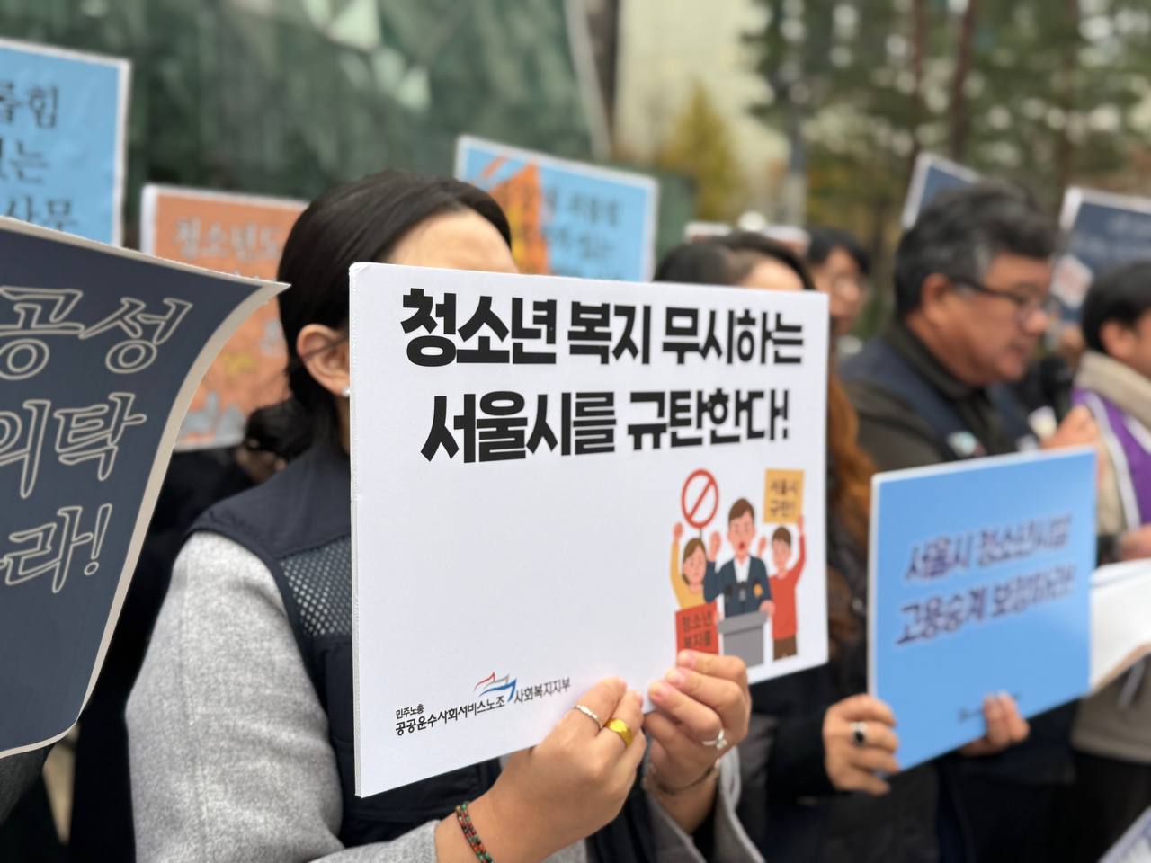 공공운수노조 사회복지지부(지부장 김희라)는 25일 오전 서울시청 앞에서 기자회견을 열어 “위기청소년을 상담하고 지원하는 센터 종사자가 자주 바뀌어 연속성을 잃으면 무엇보다 청소년에게 좋지 않다”며 “서울시가 고용승계 책임을 포기했다”고 비판했다.