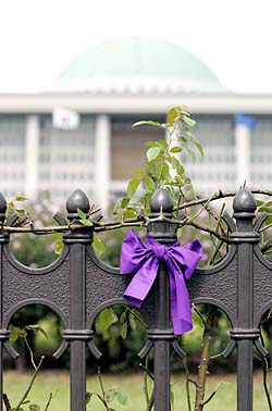 민주노동당은 13일 여의도 국회 정문 앞에서 ‘국가보안법 완전 폐지를 위한 투쟁선포 기자회견’을 갖고, 이번 정기국회에서 반드시 ‘폐지’를 이뤄내겠다는 의지를 밝혔다.민주노동당 관계자들은 이날 행사에서 ‘국가보안법 폐지를 상징하는 보라색 리본’을 국회 담벼락에 매다는 상징의식을 갖기도 했다.고난과 인권의 상징인 보라색의 힘이 과연 국회를 움직일 수 있을지 지켜보자.