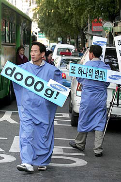 ‘또 하나의 가족’ 삼성 광고를 빗댄 노동자 감시용 불법복제 휴대폰 모형이 선보인 이날 집회에서는 ‘또 하나의 범죄’ 삼성의 노동탄압 실상이 적나라하게 폭로됐다. 민주노총과 인권· 시민단체로 구성된 ‘삼성노동자감시공대위’가 공동주최한 이날 집회에서 30여명의 참가자들은 삼성을 맹렬히 성토했다.