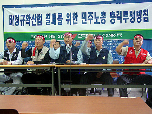 민주노총 각 연맹과 지역본부 간부, 조합원 500여명이 참가한 이날 결의대회에서 참가자들은 정부의 ‘비정규 개악안’ 통과 방침에 총파업으로 맞설 것임을 분명히 했다.