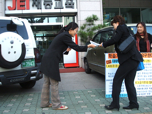 지난 21일도 서울 금천, 안양지역 선전전이 있었다. “사무실 내에는 불법이니 나가라, 경찰 부르겠다.” 학습지 관리자들과 다툼도 많이 생긴다. 그러나 이수정 교사는 잡상인보다 못한 취급을 받더라도 굽히지 않는다. 조합가입은 선뜻 나서지 못하지만 호의적인 반응을 보이는 학습지 교사들이 있기 때문이다. “떡도 나눠주고, 수고한다며 박수치는 교사들을 보면 힘이 나죠.”