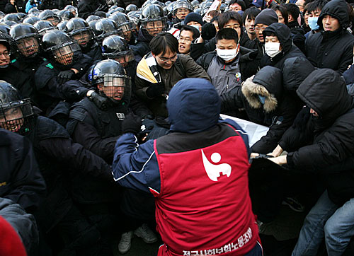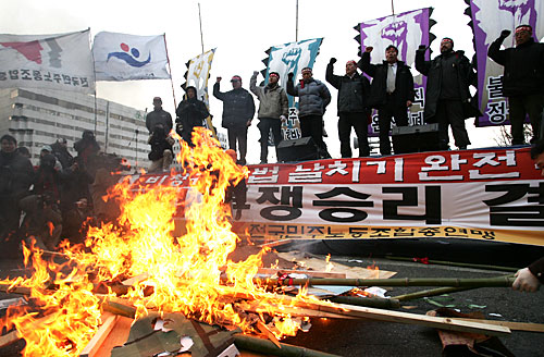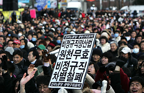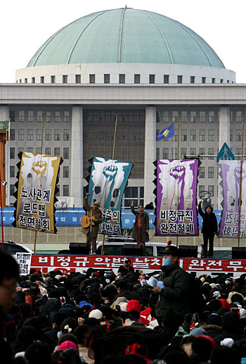 2일에도 국회 앞에서는 민주노총 주최 '총파업 투쟁승리 결의대회'가 열렸다. 집회에 참가한 노동자들은 "날치기 비정규악법 원천무효", "비정규직 차별철폐"를 외치며 투쟁의 결의를 다졌다.