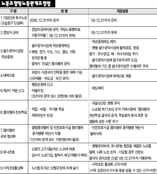 특히 노동부는 직권중재제도 폐지, 대체근로 도입, 부당해고시 벌칙삭제, 정리해고 후 재고용 의무화, 근로계약 및 해고통지 서면화 등을 노사관계 법·제도 선진화의 ‘획을 긋는’ 중요한 진전을 이룬 것이라고 강조했다.
