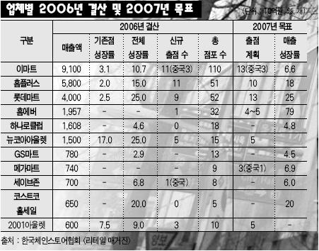 홈플러스는 지난해 11개 신규점을 개점, 5조8천억원의 매출을 올렸다. 롯데마트의 지난해 매출액은 4조원이며, 9개 신규점을 개점했다. 까르푸 인수로 업계의 관심을 한몸에 받고 있는 홈에버의 지난해 매출액은 1조9천500억원. 그밖에 농협유통(하나로클럽+하나로마트)이 1조6천억원, 뉴코아아울렛 1조5천억원, GS마트 7천800억원, 세이브존 7천억원, 메가마트 7천400억원, 코스트코 홀세일 6천500억원, 2001아울렛 6천억원 등 매출을 올렸다.