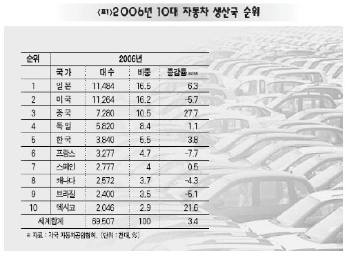 역시 눈에 띄는 국가는 중국이다. ‘자동차산업의 블랙홀’로 불리는 중국은 지난해 728만대로 3위를 기록했다. 2005년(570만1천대)에 비해 무려 27.7% 증가했다. 협회 관계자는 “중국의 자동차 내수가 증가하면서 현지공장을 가진 완성차 메이커들의 생산량이 대폭 늘어났다”고 말했다.